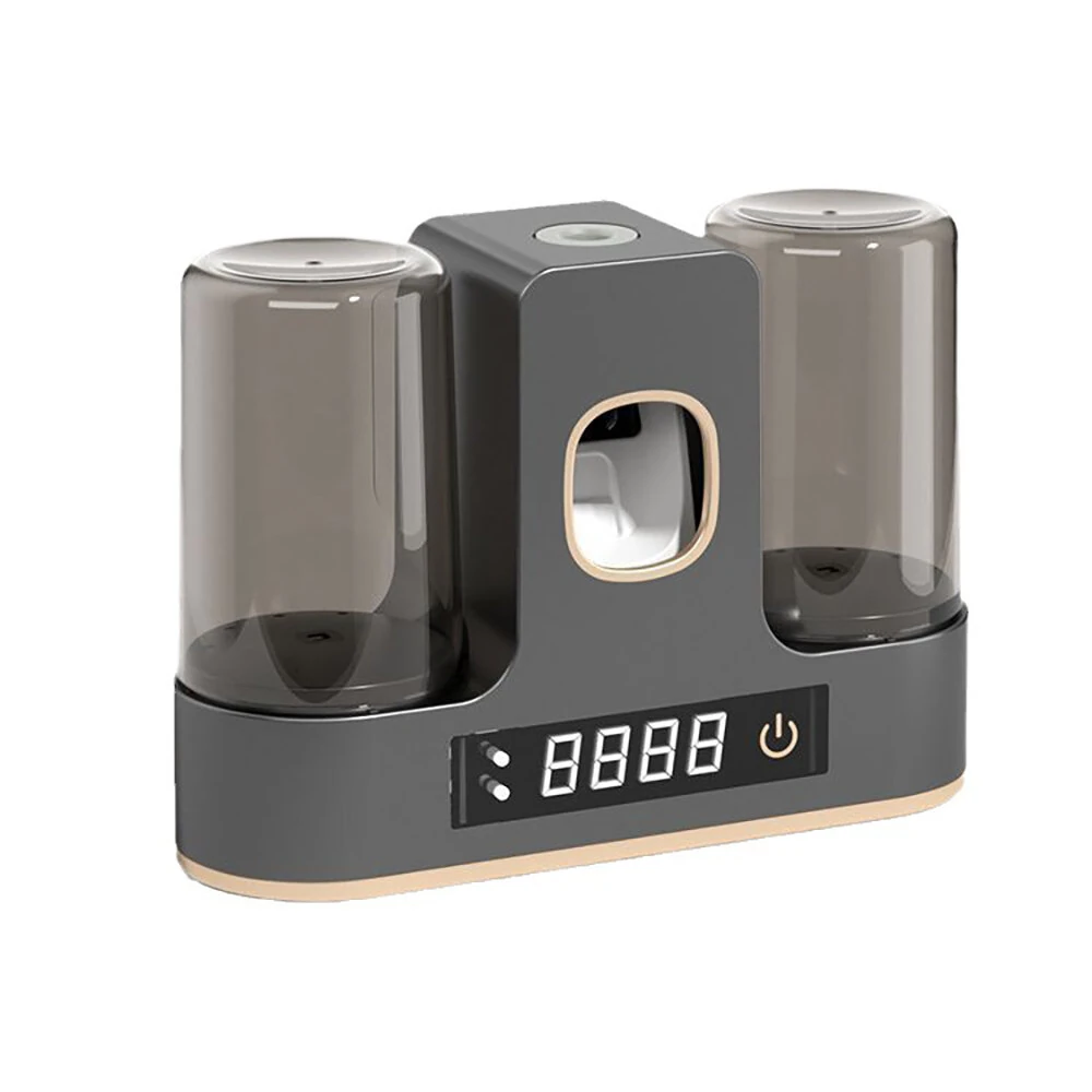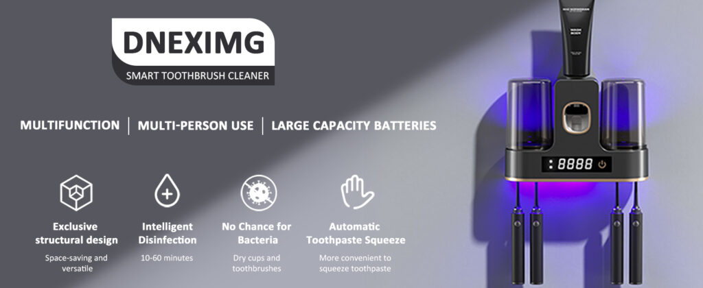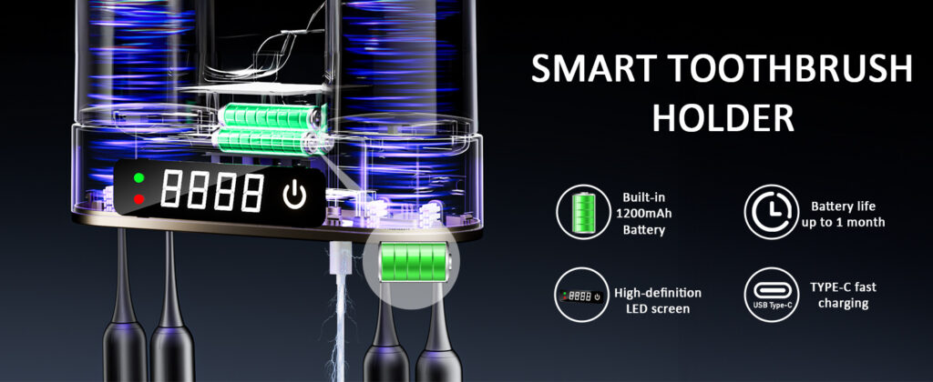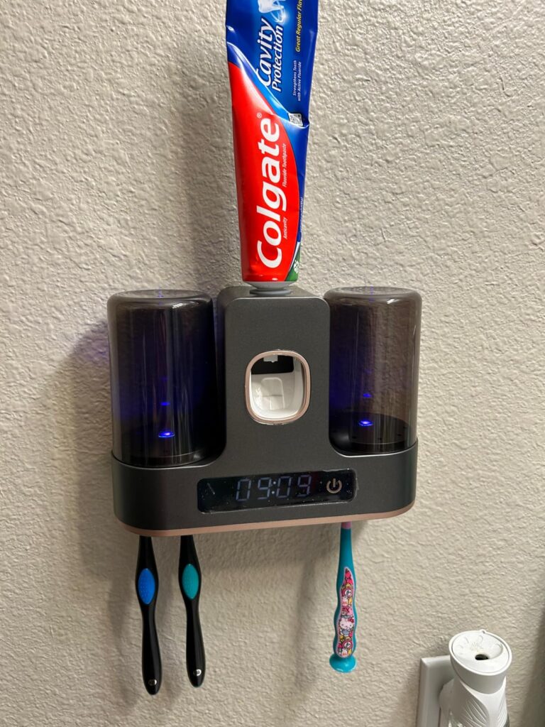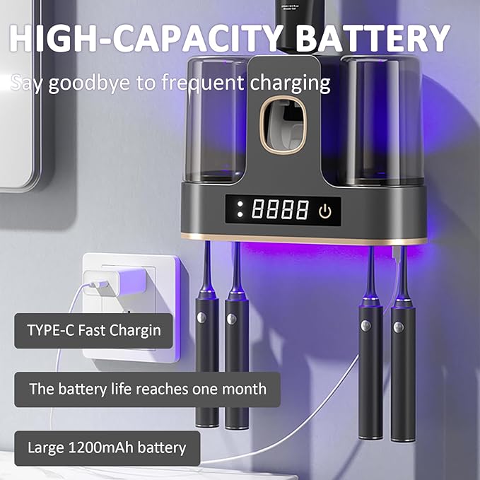 “Upgrade your bathroom hygiene with our Smart UV Toothbrush Sterilizer. Featuring a sleek black and gold finish, this intelligent organizer keeps your counters clutter-free while actively killing 99.9% of germs on your brush heads using advanced UV-C technology. The integrated digital display keeps you informed of sterilization cycles, while the magnetic inverted cups ensure a dry, mold-free rinse every time. With a built-in automatic toothpaste dispenser and long-lasting wireless battery, it is the ultimate combination of luxury, technology, and cleanliness.”
