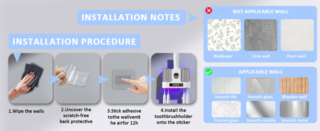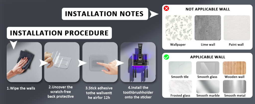 The device comes with a heavy-duty, waterproof adhesive bracket. Simply clean your wall, stick the bracket, and let it cure for 24 hours before hanging the unit. It is strong enough to hold the weight of the device, four brushes, and a full tube of toothpaste without falling.